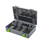 Kaste izgatavota no izturīgas plastmasas, kas paredzēta ilgstošai lietošanai. Drošie fiksatori uz vāka un iekšējiem nodalījumiem samazina nejaušas atvēršanās risku transportēšanas laikā. Uz vāka integrēta lineāla skala, kas ļauj precīzi izmērīt montāžas vai pavadiņas garumu tieši uz vietas.