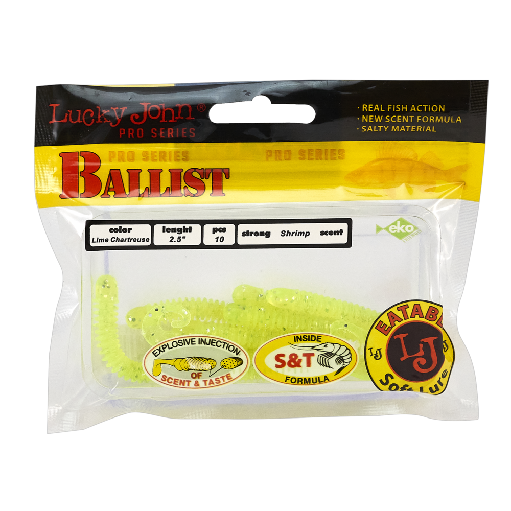Lucky John BALLIST ir hibrīda māneklis, kas apvieno tārpa un tvistera īpašības, ar ilgnoturīgu garneles aromātu. Māneklim ir iegarens, rievots, tārpam līdzīgs korpuss un maza, mīksta tvistera aste. Tas var imitēt dēli vai lielu nimfu. Ideāli piemērots mikrodžigam. BALLIST ir pieejams vairākās krāsu variācijās un divos izmēros – 2,5” (6,3 cm) un 3,3” (8.4 cm).Rekomendējam - asaru un zandartu copei.