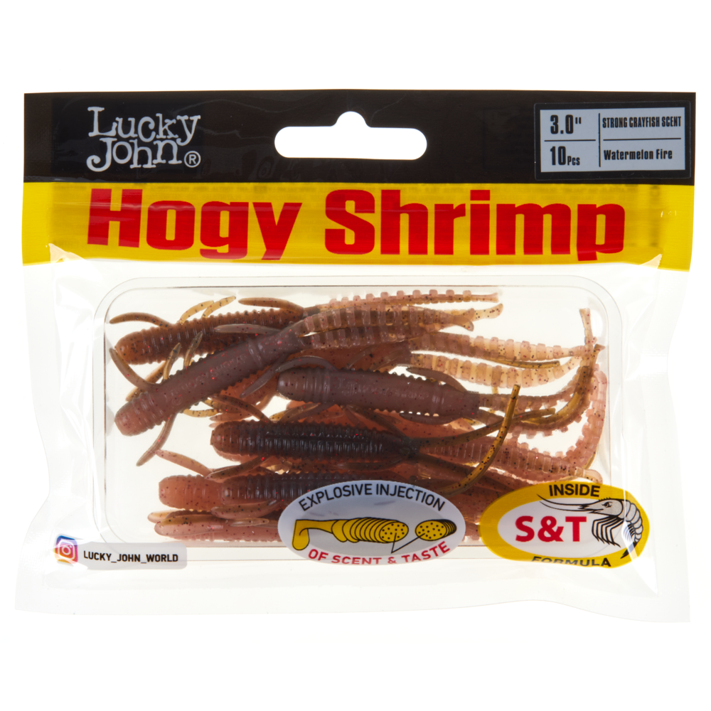 Lucky John HOGY SHRIMP ir māneklis, kas imitē fantāzijas tipa zemūdens vēzi ar daudzām kājiņām, kas ir iecienīts lielu asaru un citu plēsīgo zivju medījums. HOGY SHRIMP ir pasīvais māneklis, impregnēts ar noturīgu vēžu aromātu. Tas ir ļoti efektīvs gan saldūdens, gan sālsūdens makšķerēšanā un īpaši ieteicams asaru un zandartu ķeršanai. HOGY SHRIMP ir pieejams dažādās dabiskās krāsās un trīs izmēros – 2,2” (5,6 cm), 3” (7,6 cm) un 3,5” (8,9 cm).