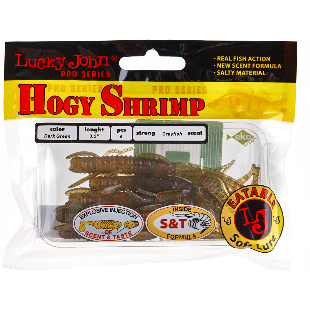 Lucky John HOGY SHRIMP ir māneklis, kas imitē fantāzijas tipa zemūdens vēzi ar daudzām kājiņām, kas ir iecienīts lielu asaru un citu plēsīgo zivju medījums. HOGY SHRIMP ir pasīvais māneklis, impregnēts ar noturīgu vēžu aromātu. Tas ir ļoti efektīvs gan saldūdens, gan sālsūdens makšķerēšanā un īpaši ieteicams asaru un zandartu ķeršanai. HOGY SHRIMP ir pieejams dažādās dabiskās krāsās un trīs izmēros – 2,2” (5,6 cm), 3” (7,6 cm) un 3,5” (8,9 cm).