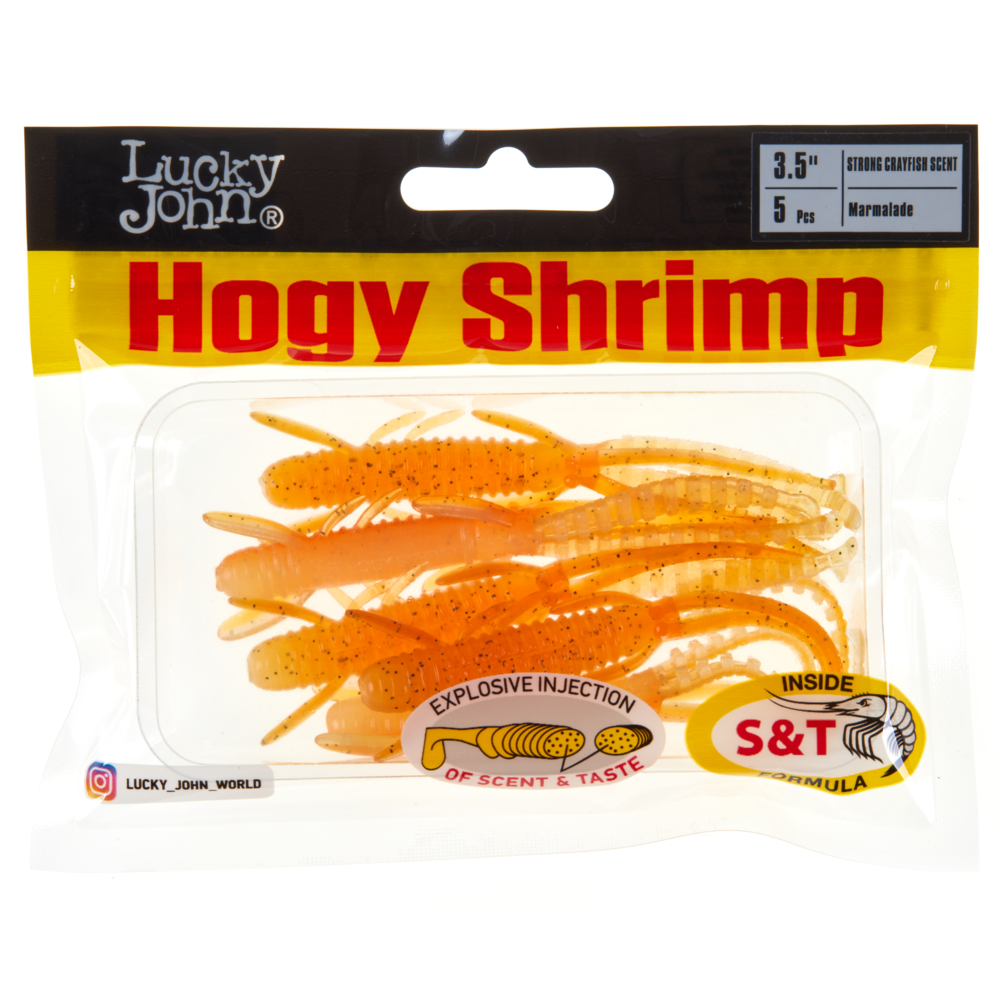 Lucky John HOGY SHRIMP ir māneklis, kas imitē fantāzijas tipa zemūdens vēzi ar daudzām kājiņām, kas ir iecienīts lielu asaru un citu plēsīgo zivju medījums. HOGY SHRIMP ir pasīvais māneklis, impregnēts ar noturīgu vēžu aromātu. Tas ir ļoti efektīvs gan saldūdens, gan sālsūdens makšķerēšanā un īpaši ieteicams asaru un zandartu ķeršanai. HOGY SHRIMP ir pieejams dažādās dabiskās krāsās un trīs izmēros – 2,2” (5,6 cm), 3” (7,6 cm) un 3,5” (8,9 cm).