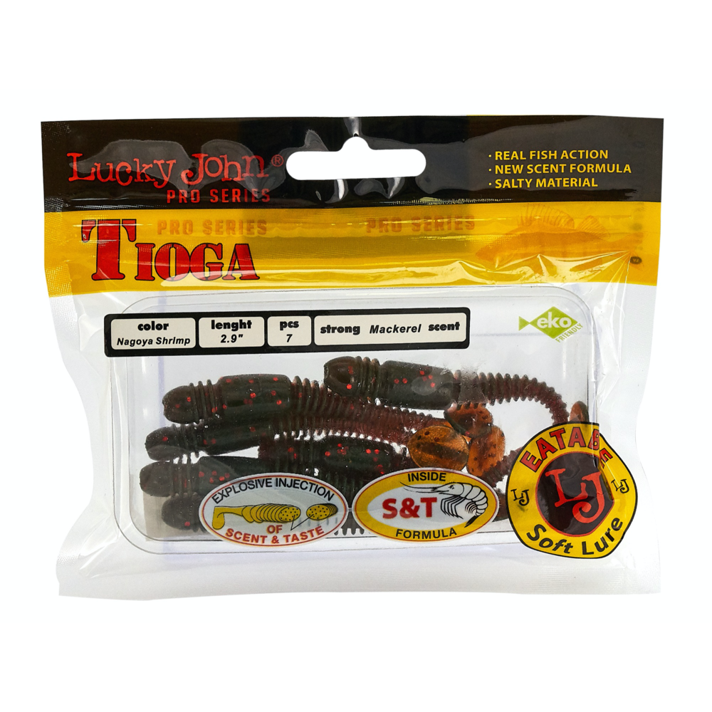 Lucky John TIOGA ir māneklis, kas īpaši izstrādāts asaru un zandartu ķeršanai. Unikālā korpusa forma ūdenī rada šūpojošas kustības, kas piesaista plēsējus. Sānu rievojums pastiprina mānekļa spēli, padarot tā kustības dabiskākas. Šim hibrīda māneklim ir tārpam līdzīgs korpuss ar raksturīgu sabiezinājumu priekšējā daļā un nelielu astīti. Māneklis ir impregnēts ar noturīgu makreles aromātu. TIOGA ir pieejams vairākās krāsu variācijās un 5 izmēros – 2” (5,1 cm), 2,4” (6,1 cm), 2,9” (7,4 cm), 3,4” (8,6 cm) un 3,9” (9,9 cm).