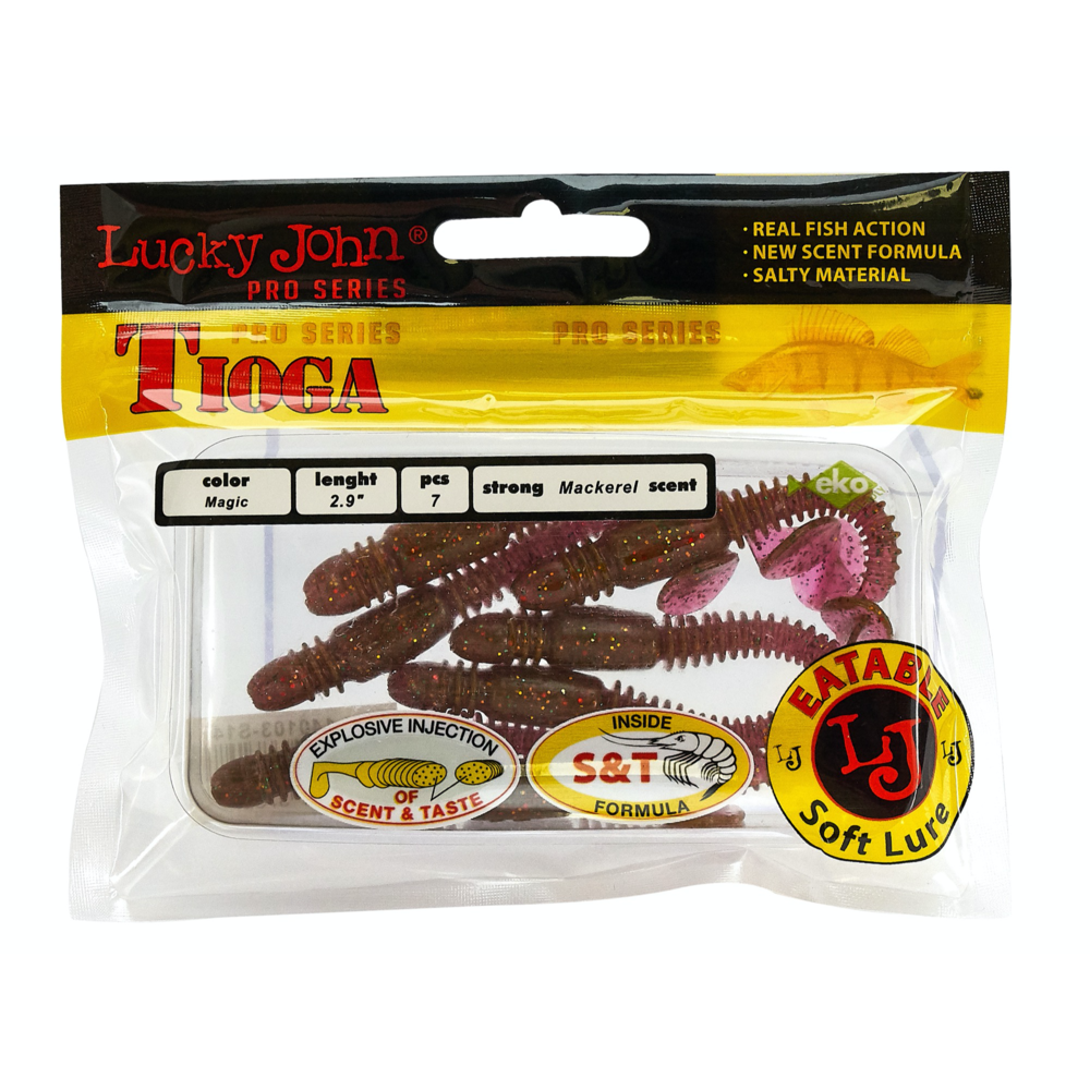 Lucky John TIOGA ir māneklis, kas īpaši izstrādāts asaru un zandartu ķeršanai. Unikālā korpusa forma ūdenī rada šūpojošas kustības, kas piesaista plēsējus. Sānu rievojums pastiprina mānekļa spēli, padarot tā kustības dabiskākas. Šim hibrīda māneklim ir tārpam līdzīgs korpuss ar raksturīgu sabiezinājumu priekšējā daļā un nelielu astīti. Māneklis ir impregnēts ar noturīgu makreles aromātu. TIOGA ir pieejams vairākās krāsu variācijās un 5 izmēros – 2” (5,1 cm), 2,4” (6,1 cm), 2,9” (7,4 cm), 3,4” (8,6 cm) un 3,9” (9,9 cm).