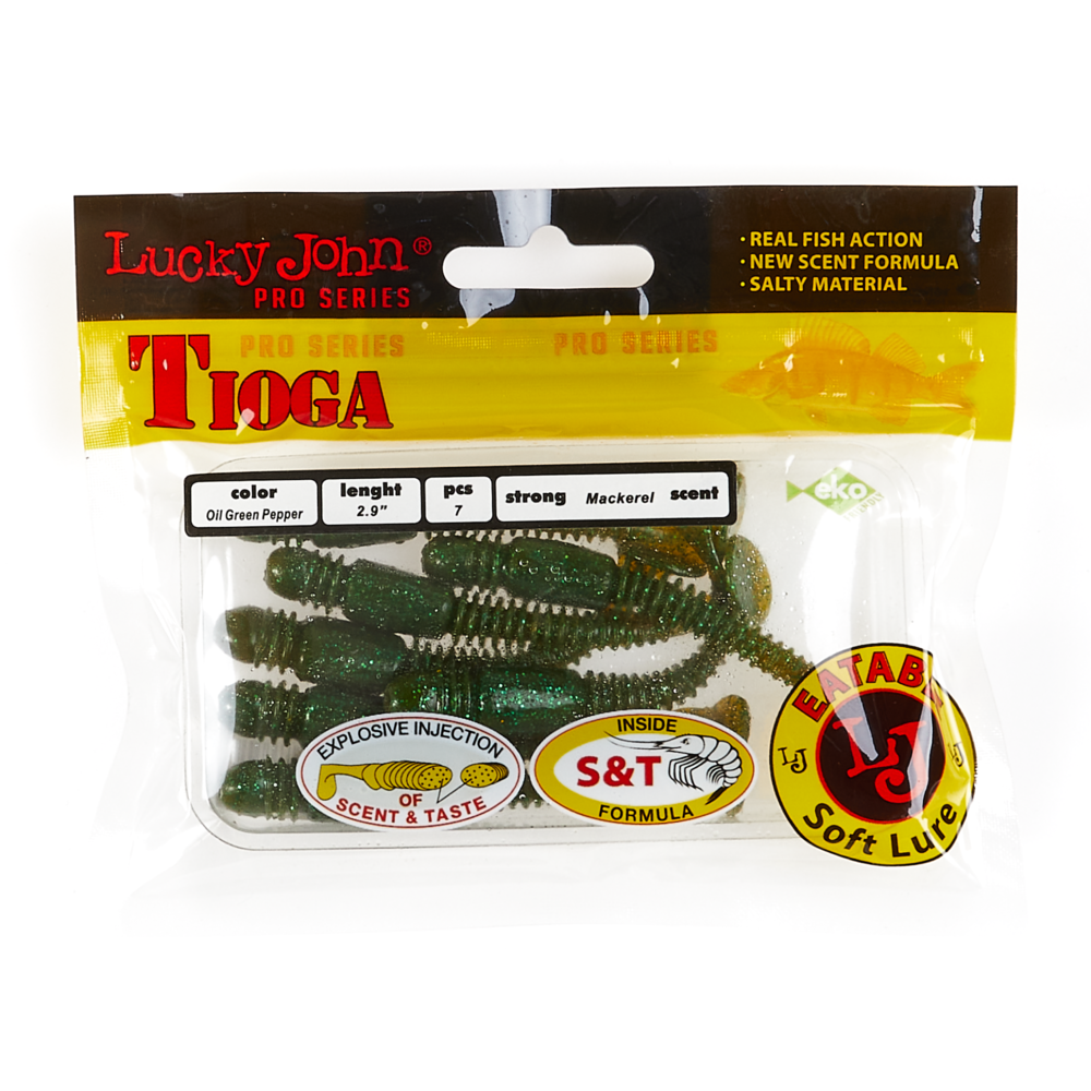 Lucky John TIOGA ir māneklis, kas īpaši izstrādāts asaru un zandartu ķeršanai. Unikālā korpusa forma ūdenī rada šūpojošas kustības, kas piesaista plēsējus. Sānu rievojums pastiprina mānekļa spēli, padarot tā kustības dabiskākas. Šim hibrīda māneklim ir tārpam līdzīgs korpuss ar raksturīgu sabiezinājumu priekšējā daļā un nelielu astīti. Māneklis ir impregnēts ar noturīgu makreles aromātu. TIOGA ir pieejams vairākās krāsu variācijās un 5 izmēros – 2” (5,1 cm), 2,4” (6,1 cm), 2,9” (7,4 cm), 3,4” (8,6 cm) un 3,9” (9,9 cm).