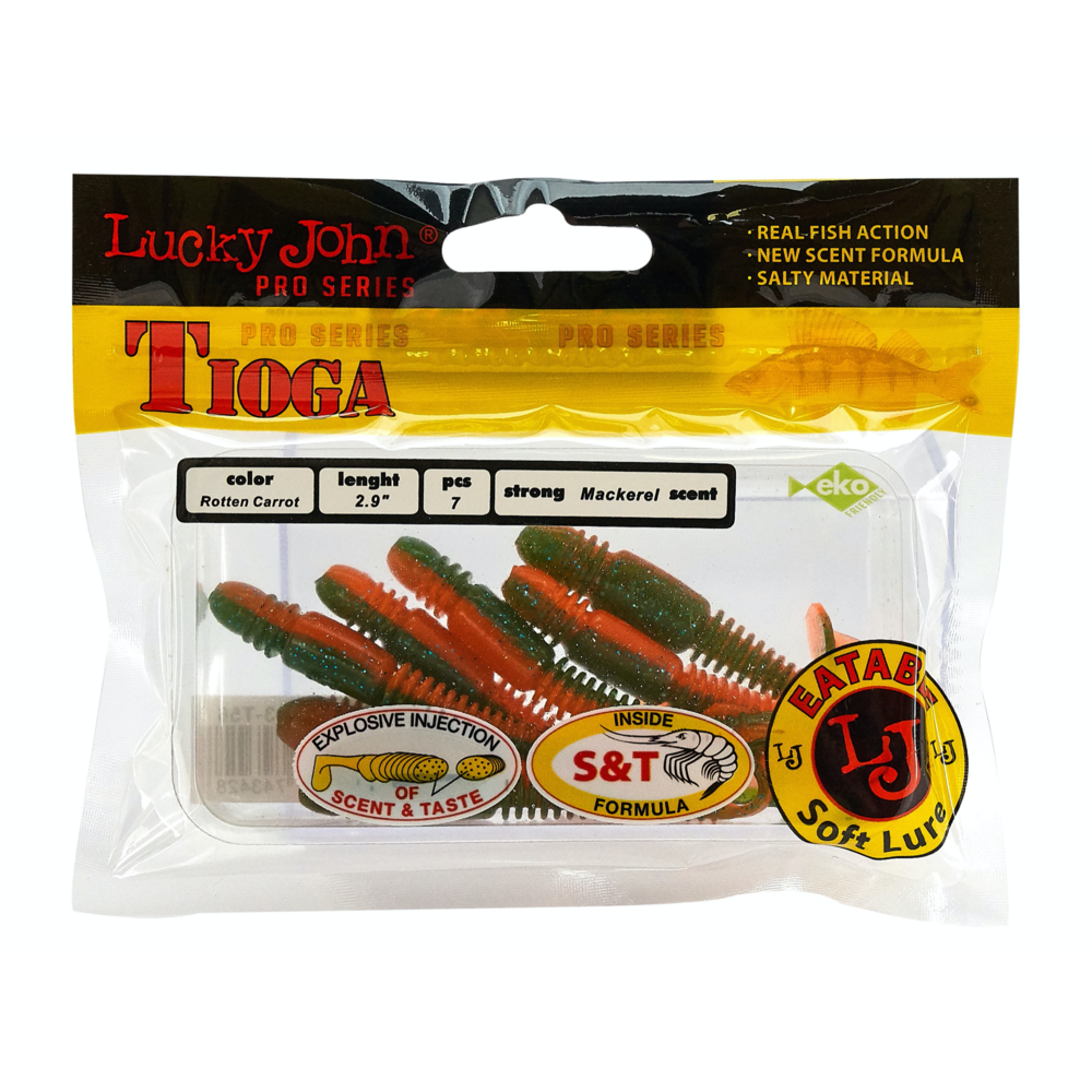 Lucky John TIOGA ir māneklis, kas īpaši izstrādāts asaru un zandartu ķeršanai. Unikālā korpusa forma ūdenī rada šūpojošas kustības, kas piesaista plēsējus. Sānu rievojums pastiprina mānekļa spēli, padarot tā kustības dabiskākas. Šim hibrīda māneklim ir tārpam līdzīgs korpuss ar raksturīgu sabiezinājumu priekšējā daļā un nelielu astīti. Māneklis ir impregnēts ar noturīgu makreles aromātu. TIOGA ir pieejams vairākās krāsu variācijās un 5 izmēros – 2” (5,1 cm), 2,4” (6,1 cm), 2,9” (7,4 cm), 3,4” (8,6 cm) un 3,9” (9,9 cm).
