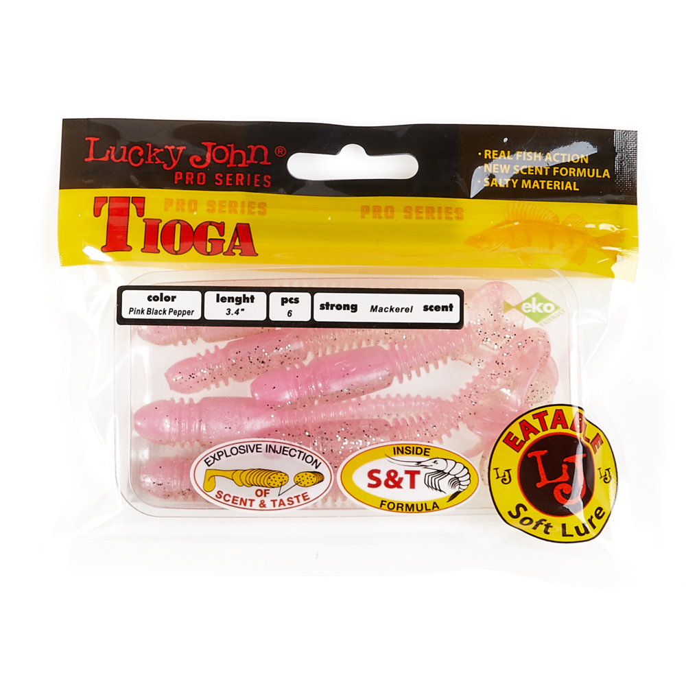 Lucky John TIOGA ir māneklis, kas īpaši izstrādāts asaru un zandartu ķeršanai. Unikālā korpusa forma ūdenī rada šūpojošas kustības, kas piesaista plēsējus. Sānu rievojums pastiprina mānekļa spēli, padarot tā kustības dabiskākas. Šim hibrīda māneklim ir tārpam līdzīgs korpuss ar raksturīgu sabiezinājumu priekšējā daļā un nelielu astīti. Māneklis ir impregnēts ar noturīgu makreles aromātu. TIOGA ir pieejams vairākās krāsu variācijās un 5 izmēros – 2” (5,1 cm), 2,4” (6,1 cm), 2,9” (7,4 cm), 3,4” (8,6 cm) un 3,9” (9,9 cm).