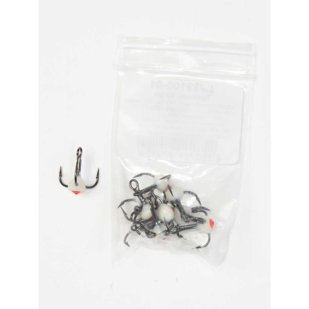 Trijžuburu āķis ar krāsainu pilienu balansieru vai citu ziemas mānekļu aprīkošanai.
