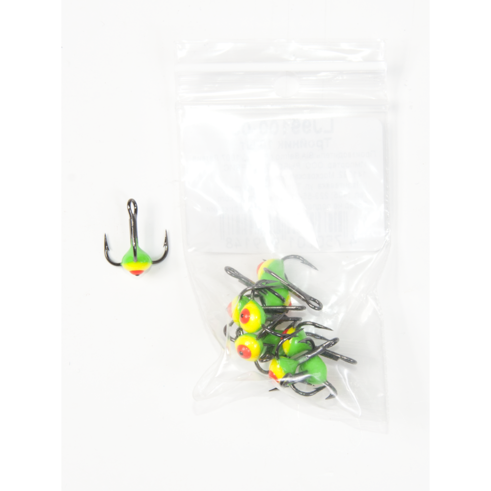 Trijžuburu āķis ar krāsainu pilienu balansieru vai citu ziemas mānekļu aprīkošanai.