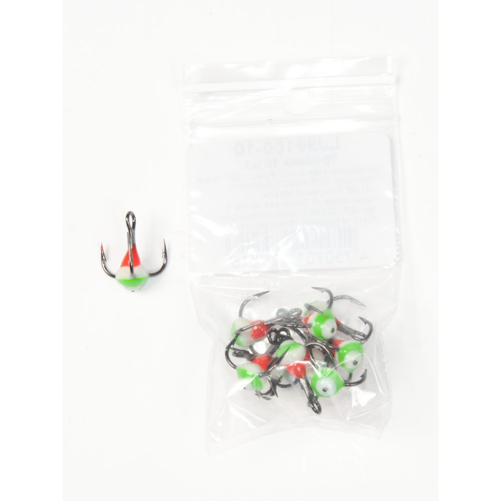 Trijžuburu āķis ar krāsainu pilienu balansieru vai citu ziemas mānekļu aprīkošanai.
