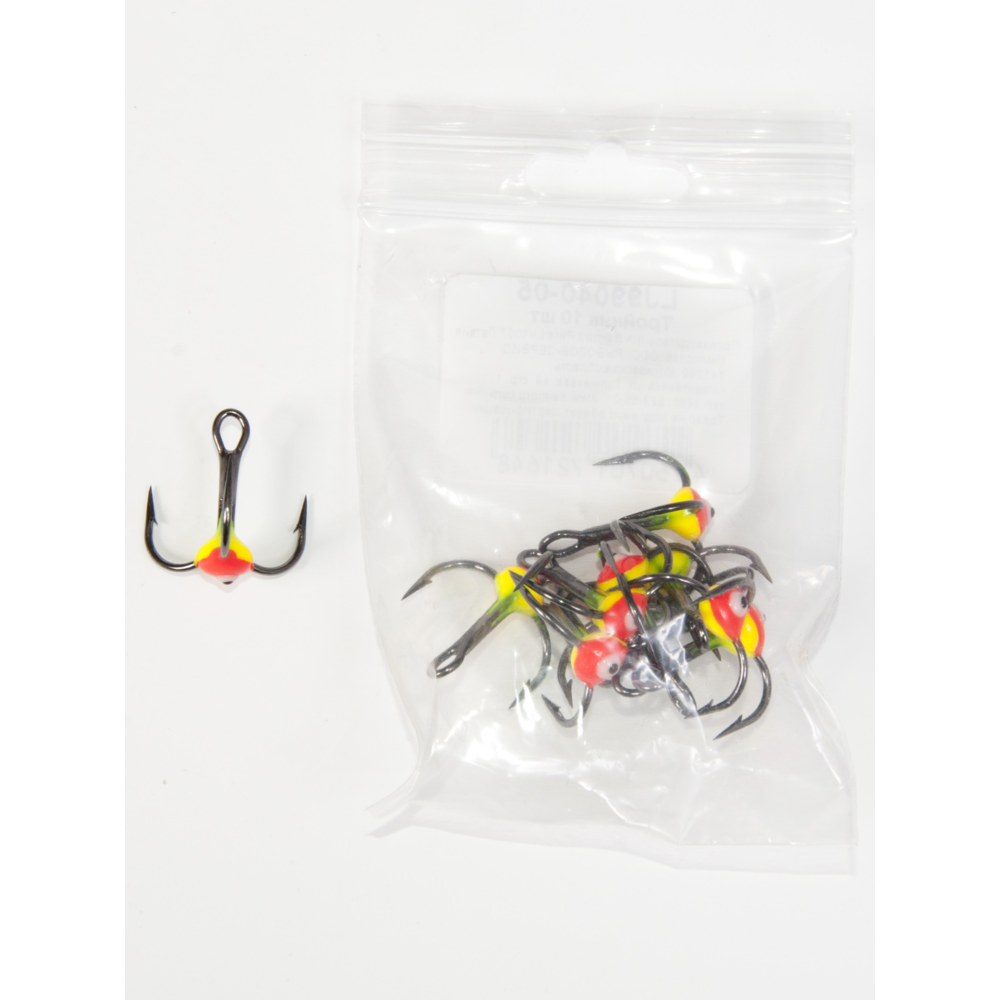 Trijžuburu āķis ar krāsainu pilienu balansieru vai citu ziemas mānekļu aprīkošanai.