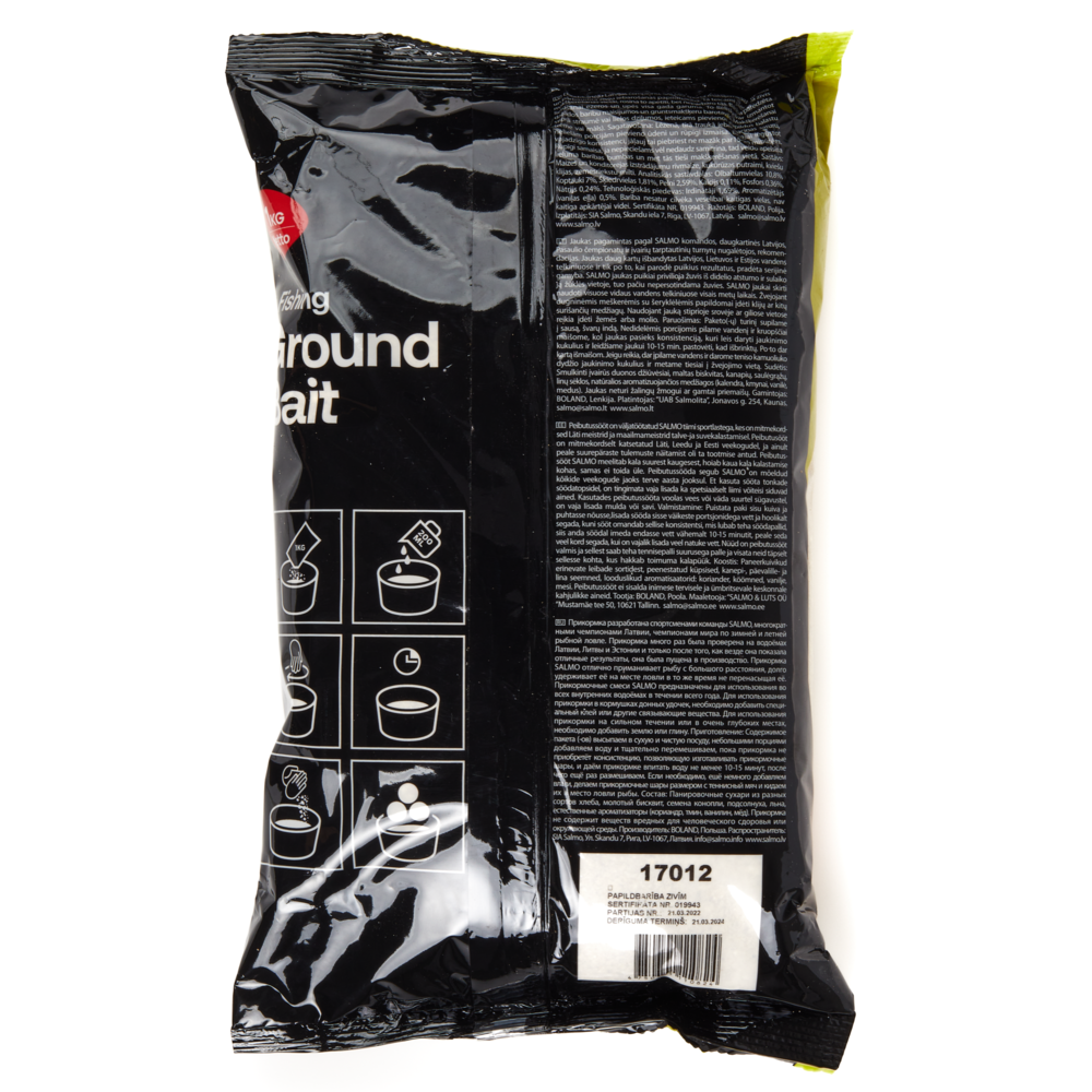 Многократными чемпионами Латвии, рыболовами-спортсменами SALMO разработана и проверена прикормка для рыб. Она отлично привлекает рыбу к месту ловли, возбуждает ее аппетит, но не перекармливает. Прикормка предназначена для применения на озерах и реках круглый год, ее превосходно можно использовать в различных прикормочных смесях и доночных кормушках. При ловле на сильном течении или на больших глубинах рекомендуется добавлять дополнительный балласт (землю или глину). Прикормка производится из натуральных компонентов, в ее составе много сортов зерновых, семечки, жмых, молотое печенье разных сортов, панировочные сухари разных сортов, натуральные ароматизаторы (кориандр, тмин, ваниль и мед). Она не содержит опасных для здоровья человека веществ и не загрязняет окружающую среду.